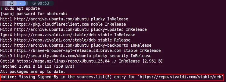 Sometimes this repo doesn’t normally populate the GPG keying for the Vivaldi Browser repository, and you will get errors like below, whenever you do a system update like this: