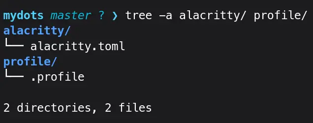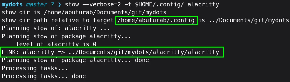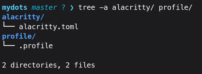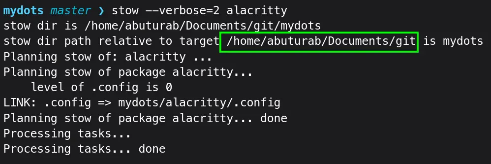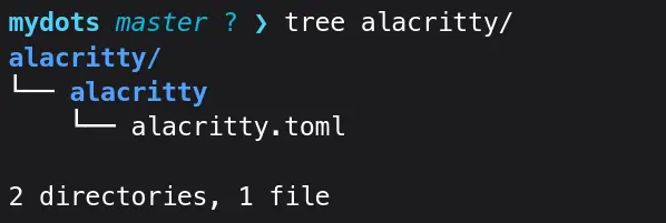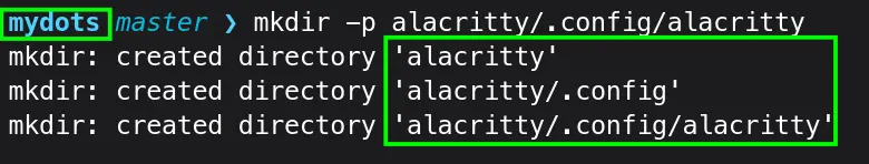 The ~/mydots/alacritty/.config/alacritty directory will be created. My mydots directory was completely empty, so -p flag made all the directories in one go.
