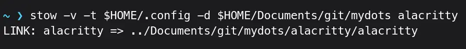 When you reinstall, or $HOME/.config/alacritty/ directory doesn’t exist, running stow alacritty will take care of creating a $HOME/.config/alacritty directory and symlinking the alacritty config directory to the stow directory.