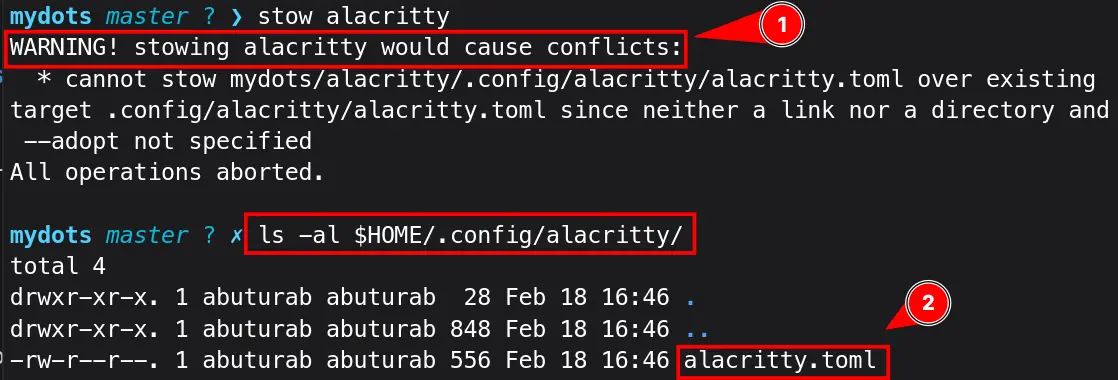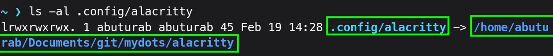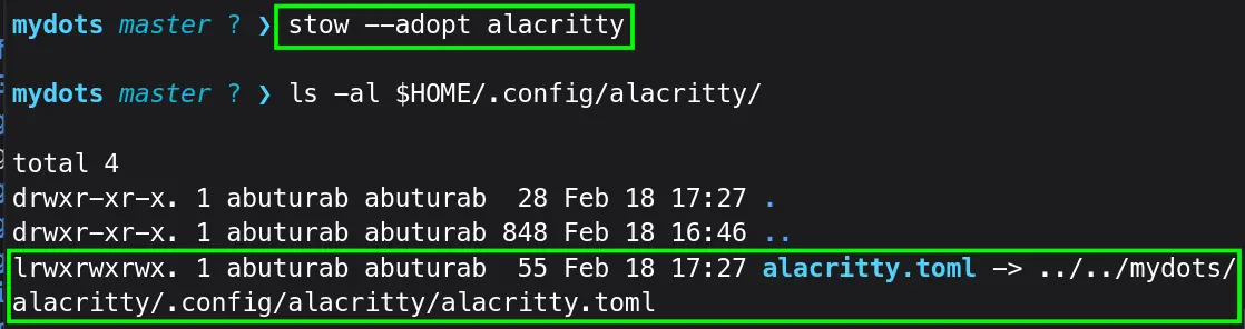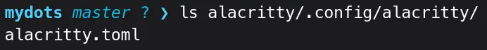 Let’s go one step further, move alacritty.toml to mydots/alacritty, and delete .config/alacritty inside the mydots/alacritty directory.