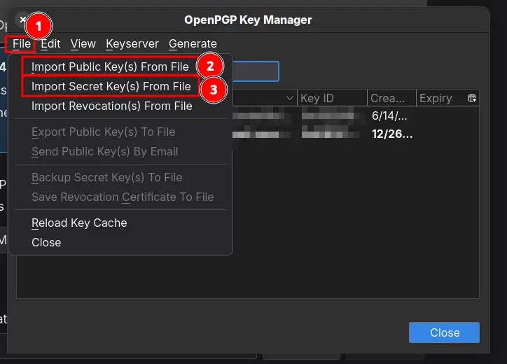 With OpenPGP Key Manager, you can import your both public and private/secret keys separately by click on file button up-top.